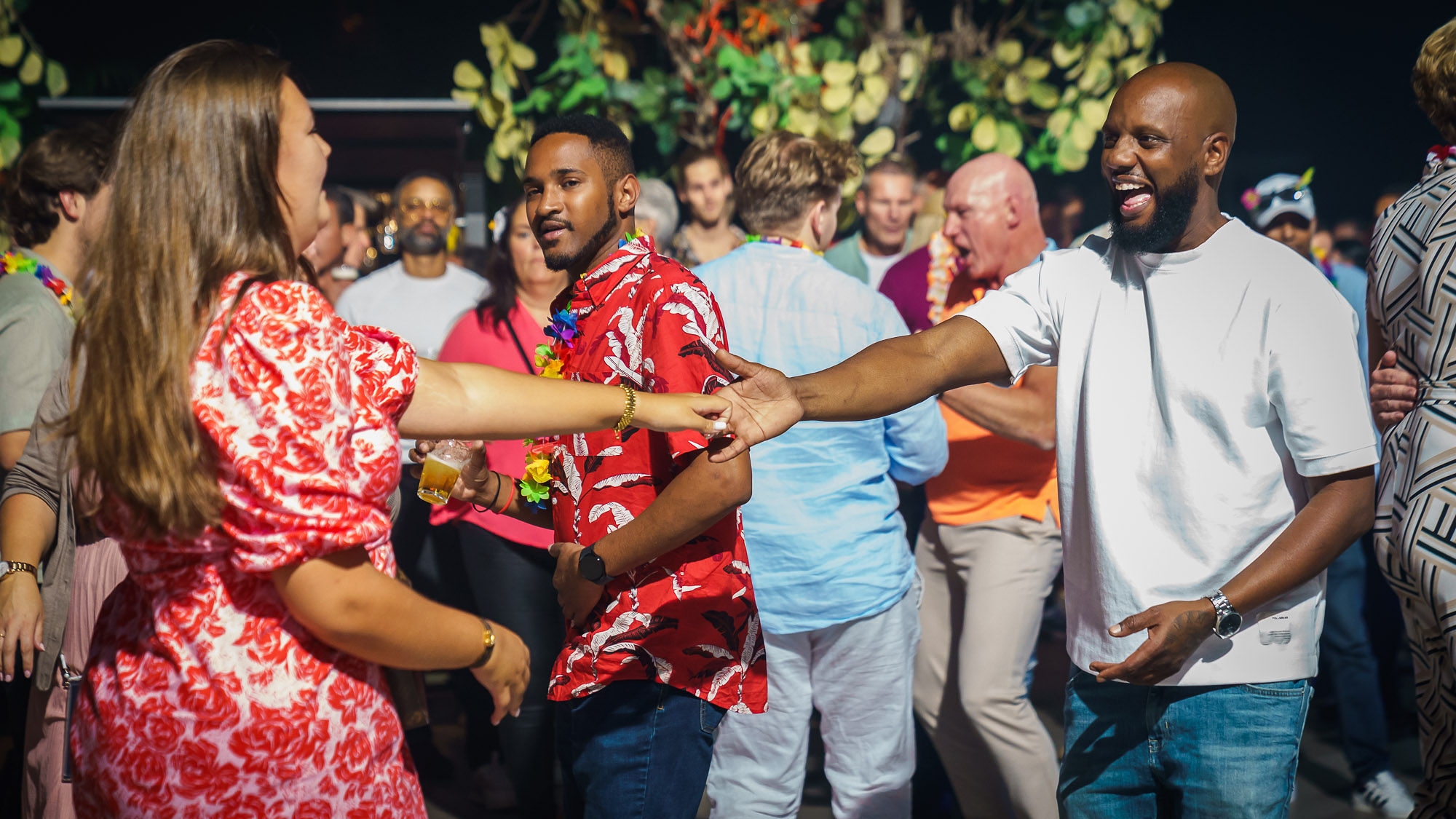 Later op de avond komt de DJ. De lichten dimmen, de beats gaan omhoog en het tempo komt erin. Denk aan zomerse classics, latin hits, en dansbare disco. Eventueel met percussie of live sax eroverheen. Voetjes gaan van de vloer, de sangria’s blijven komen en collega’s die je normaal in meetings ziet, staan nu te dansen op slippers. Dit is geen standaard personeelsfeest, dit is een mini-vakantie vol collegapret!